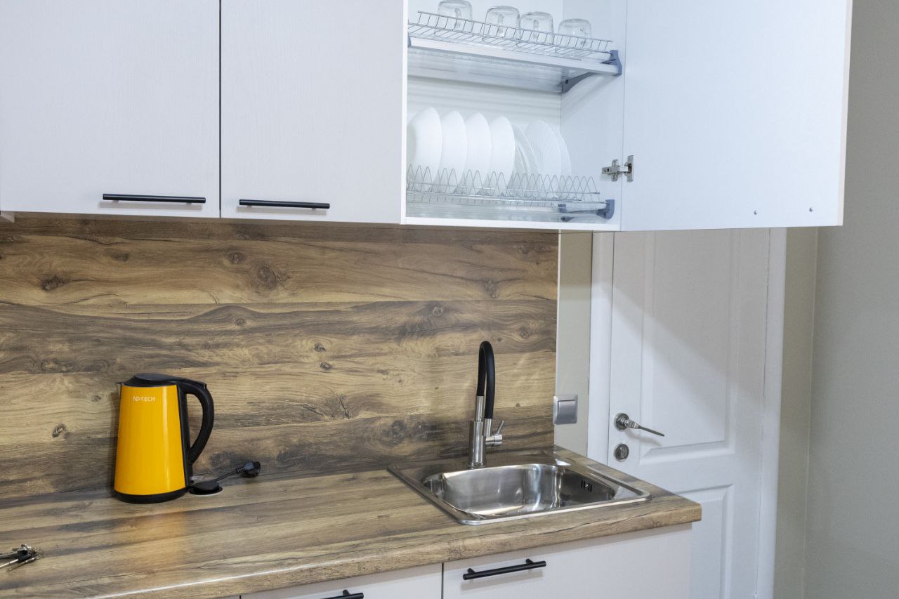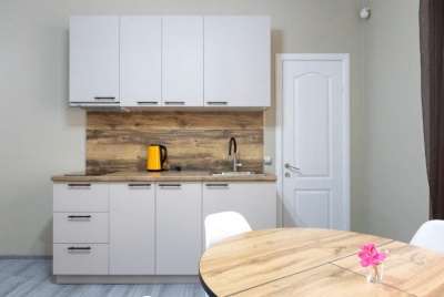 Мы спроектировали стильные и практичные кухонные гарнитуры. Светло-серые матовые фасады, столешница и фартук «под дерево», черная фурнитура и смеситель — такое сочетание выглядит современно и дорого. Вся необходимая техника и посуда легко размещаются даже на небольшой площади.