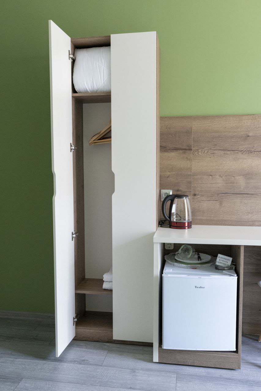 Двухдверные шкафы с гладкими белыми фасадами не перегружают пространство. Боковые стенки с текстурой дерева поддерживают общий стиль, а продуманное внутреннее наполнение позволяет гостям удобно разместить все вещи. -
