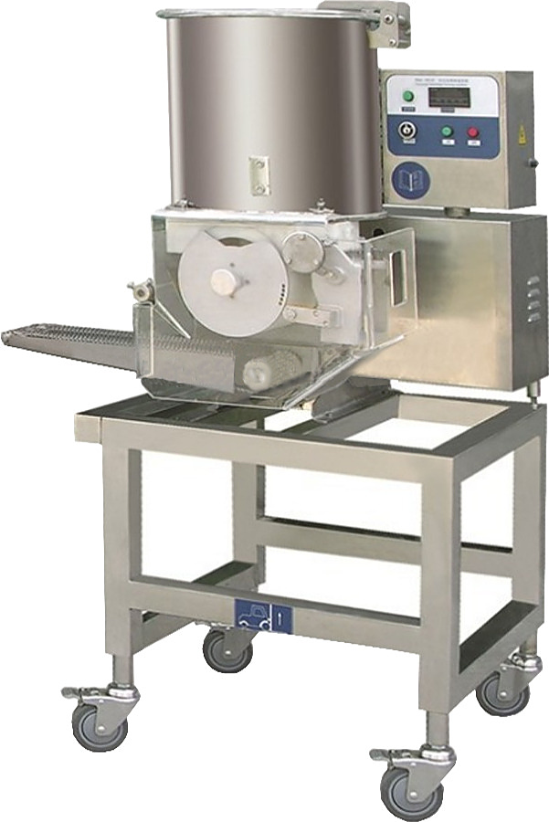 втомат котлетный состоит из бункера, внутри которого есть лопасти, которые подают фарш в барабан. В барабане имеется отверстие определенной формы и поршень в точности повторяющий форму отверстия. Барабан вращается вокруг своей оси. В верхнем положении поршень опускается, а в образованную полость подается фарш, барабан прокручивается и поршень выдавливает сформованную котлету, которая дополнительно срезается струной. В итоге котлета падает на конвейер, расположенный под барабаном. любая форма изделий – от классической круглой до фигурной. Возможно изготовление формы на барабане по индивидуальному дизайну клиента. Основное условие – форма ограничена размером 100 мм, не больше. очень удобное в обслуживании оборудование и в процессе производства легко сменить барабан, заменить фарш и перейти, например, от производства мясных котлет на куриные или овощные котлеты (морковные, свекольные и т.д.). регулировка толщины и веса изделия. На барабане имеется простая система регулировки положения поршня и соответственно р