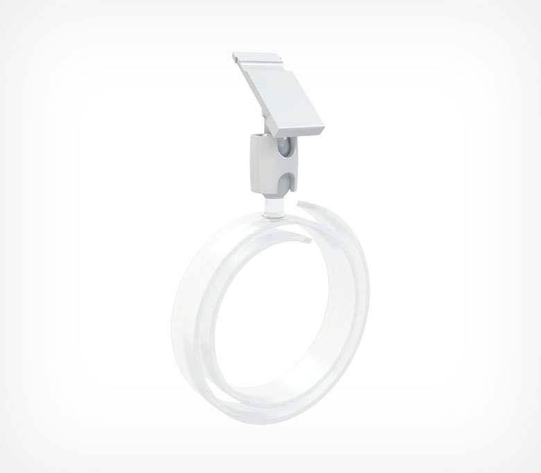 Держатель ценника-улитка на продукты цилиндрической формы. Диаметр захвата варьируется от 30 до 120 мм. Угол наклона ценника регулируется с помощью шарниров.