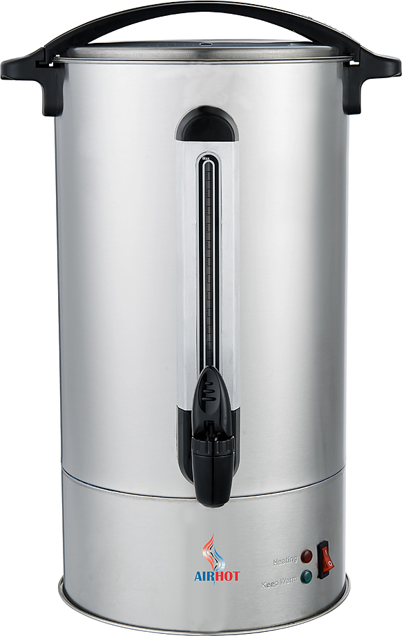 Корпус из нержавеющей стали Заливной тип подачи воды Температурный режим: +30/+100ºС Визуальный контроль уровня воды Автоматический контроль температуры воды Закрытый тэн Индикатор нагрева Время нагрева полного объема воды (мин.): 37