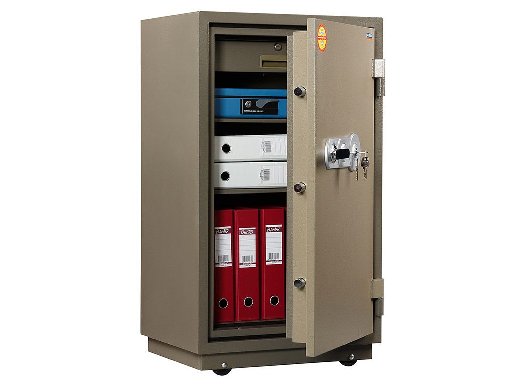 Сейф огнестойкий, производство - Россия, EU. Сертифицирован на класс 60Б (60 минут защиты от пожара) по ГОСТ Р 50862-2005. Корпус сейфа представляет собой двухслойную конструкцию с наполнением. Межстеночное пространство заполнено запатентованным составом огнестойкого бетона. Два замка ключевых, один является блокирующим, второй открывает сейф. По периметру дверной проем проклеен огнестойким уплотнителем. Внутри сейфа трейзер (внутренний ящик с замком) и 2 полки. Комплектуется колесами. Возможно крепление к полу (наличие отверстия в нижней части). Окрашен порошковой краской, цвет: корпус оттенок коричневого с эффектом молотковой эмали, дверь — оттенок зеленого с эффектом молотковой эмали.