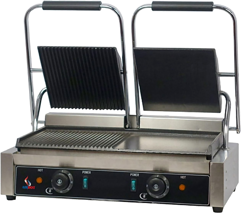 Прижимной гриль Airhot DCG-FFG предназначен для жарки мяса, птицы, рыбы, овощей, а также для приготовления стейков, гамбургеров и горячих сэндвичей на предприятиях общественного питания и торговли. Высокая скорость приготовления достигается благодаря встроенным в обе части аппарата тепловым элементам, которые плотно прилегают к продукту. Модель оснащена терморегулятором и съёмным поддоном для сбора жира и крошек. Корпус выполнен из нержавеющей стали, жарочная поверхность - из чугуна с антипригарным покрытием.