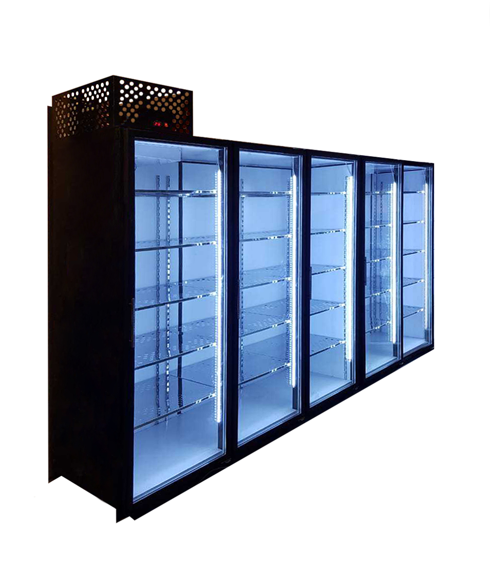 Распашные двери -5 шт стеклопакет с доводчиком двери Регулируемые ножки Полки перфорированные из нержавеющей стали 25 шт по 5 шт на 1 дверь. Регулируемые ножки по высоте Диодная подсветка Компрессор Аспера Потребляемая мощность при наборе температуры 1500Вт Газ R 404A Электронный контроллер с цифровым табло Оттайка ноу фрост Температурный режим -5…+5С° В стандартной комплектации моторная часть распологается с левой стороны Возможно сделать агрегатную часть с правой стороны , по центу, на выносном холоде в виде сплит системы или цхм. Выкипание конденсата испарителя на задней части стены. Фассад и бока стеклянного фронта черного цвета Сборно-разборный Толщина стенки 40 мм Динамическое охлаждение продукта Агрегатная часть монтируется в виде съёмной кассеты или в виде сплит-системы