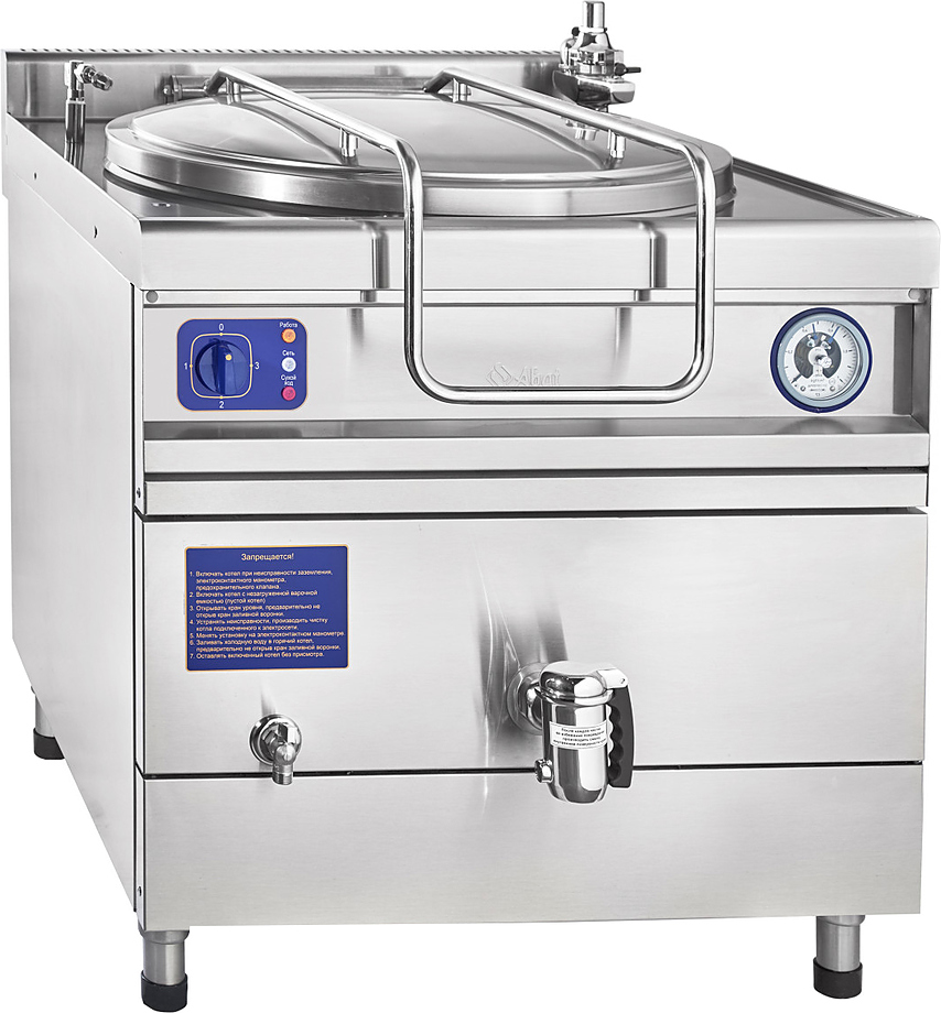 Объем котла составляет 100 литров. Три режима работы. Слив готового продукта осуществляется краном большого диаметра на лицевой панели. Удобная ручка крышки котла фиксируется в любом положении. Нагрев воды осуществляется способом "пароводяной рубашки". При отсутствии воды в "пароводяной рубашке" срабатывает автоматическое отключение нагрева. Регулируемые по высоте ножки. Корпус стационарных котлов изготовлен из стали марки AISI 304, а тигель из высококачественной коррозионностойкой стали AISI 321. Стационарные котлы можно до оснастить пароварочным комплектом КП.