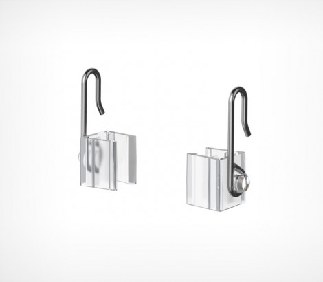 Крючок закрепляется с боковой стороны рамки. Для подвешивания одной рамки необходимо два крючка разной ориентации (правый и левый). Основание изготовлено из прозрачного ударопрочного пластика, крючок - из стального прута.