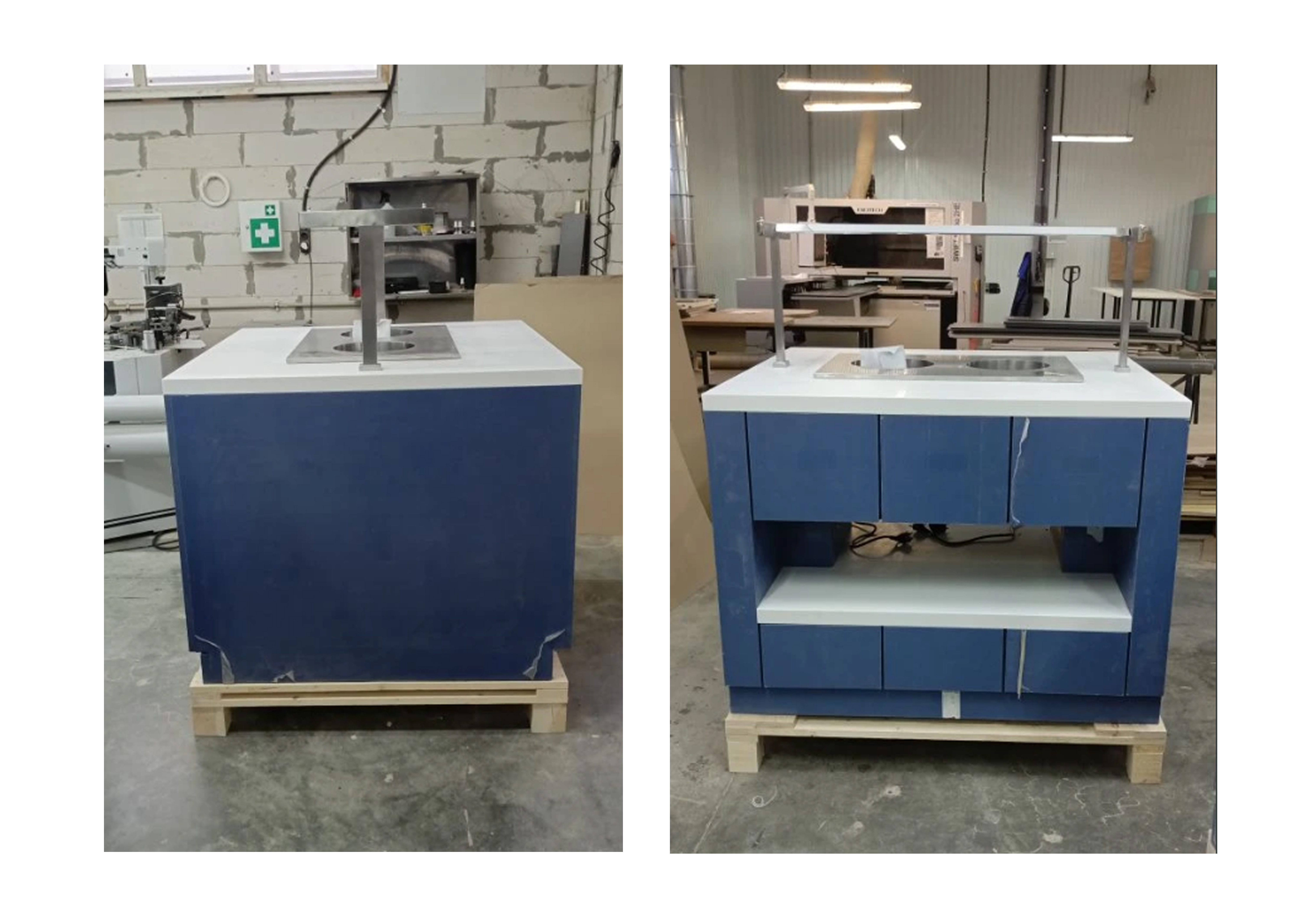 Количество конфорок, шт - 3; Объем емкости, л - 11; Мощность, кВт-1,5; Напряжение, В-220; Подсветка-есть; Рабочие температуры, °C-30...+85; кВт-1,5; Напряжение, В-220; Подсветка-есть; Рабочие температуры, °C-30...+85; Способ установки-центральный; Частота тока, Гц-50; материал изготовления встроенных горшочков - AISI 430; материал изготовления обшивки-ЛМДФ 16мм толщина в пленке ПВХ Матовый синий; материал изготовления столешницы и внутренней полки-искуственный камень Milky Way. Надстройка с подсветкой и полка с подсветкой.