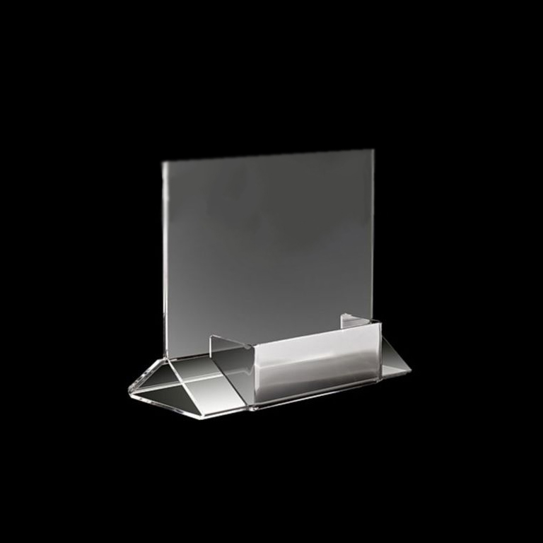 Подставка двусторонняя с визитницей широко используются в составе рекламных стоек в различных торговых точках. Изготовлена из прозрачного 1,5 мм акрила (оргстекла), а сдвижная часть из 2 мм акрила или ударопрочного полистирола. Используется для оперативного размещения информации на стойках, столах и т.п., а также в качестве ценникодержателей к крупногабаритным товарам или меню-холдера.