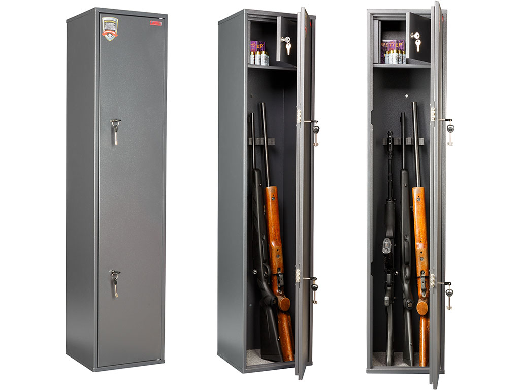 Предназначен для хранения огнестрельного оружия. Сейфы соответствуют требованиям ст.59 Постановления правительства РФ №814 от 21 июля 1998 года «О мерах по регулированию гражданского и служебного оружия и патронов к нему на территории РФ». -максимальная высота ствола - 1355 мм; -конструкция патронного отделения позволяет размещать оружие, задействуя всю высоту сейфа; -комплектуются двумя ключевыми замками; -наличие анкерных отверстий для крепления сейфа к стене; -ложементы для ружей входят в комплект поставки.