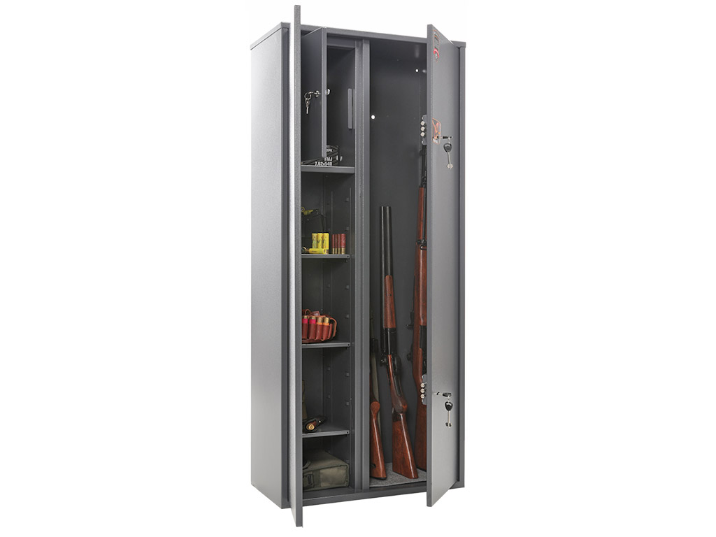 Предназначен для хранения огнестрельного оружия. Сейфы соответствуют требованиям ст.59 Постановления правительства РФ №814 от 21 июля 1998 года «О мерах по регулированию гражданского и служебного оружия и патронов к нему на территории РФ». -максимальная высота ствола - 1370 мм -комплектуются двумя ключевыми замками; -комплектуется одним «ложементом на 3 ствола и одним «ложементом на 2 ствола». Материал ИЗОПОЛ. С клеевым слоем для крепления к стенке; -наличие анкерных отверстий для крепления сейфа к стене.