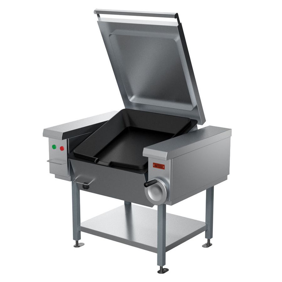 Чаша сковороды – опрокидывающаяся. Материал – чугун. Крышка выполнена из нержавеющей стали. В качестве дополнительной защиты от перегрева используется термоограничитель.