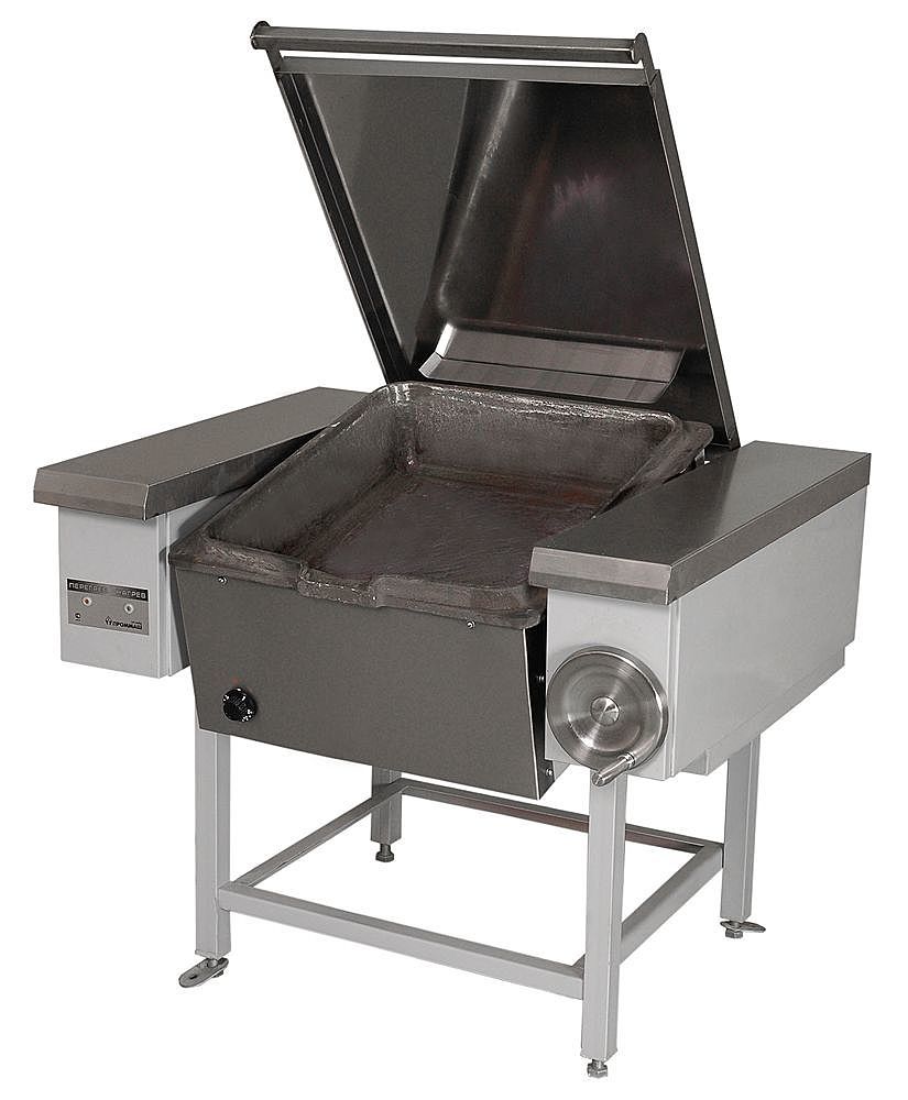 Вместимость чугунной чаши 38 л, корпус из нержавейки, разогрев до 300 °С достигается за 30 мин. Чаша сковороды наклоняется при помощи винтового механизма на угол, необходимый для удобной выгрузки продуктов. Нагрев пода чаши сковороды осуществляется спиралями.