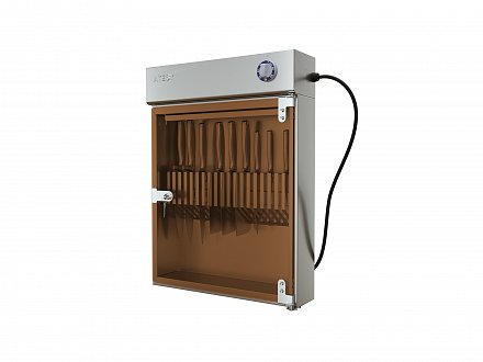 Корпус выполнен из пищевой нержавеющей стали AISI430. Стерилизатор предназначен для крепления к стене. Дверь стерилизационной камеры изготовлена из тонированного стекла, которое обеспечивает защиту персонала от воздействия ультрафиолетовых лучей. Дверь оснащена замком. Держатель для ножей выполнен из нержавеющей стали и рассчитан на 18 ножей.Держатель легкосъемный, что упрощает процесс санитарной обработки камеры. Обеззараживание происходит за счет воздействия ультрафиолетовых лучей. В приборе используется ртутная лампа с бактерицидным потоком 0,16 Вт. Стерилизатор оснащен таймером с диапазоном от 0 до 60 минут и устройством автоматического отключения работы лампы при открывании двери. Ограничения по размерам (для ножей): максимальная длина ручки - 14 см, лезвия - 28 см. Ширина каждой ячейки - 9 мм.упрощает процесс санитарной обработки камеры. Обеззараживание происходит за счет воздействия ультрафиолетовых лучей. В приборе используется ртутная лампа с бактерицидным потоком 0,16