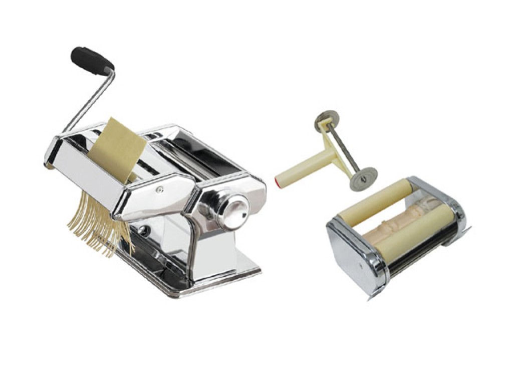 Модель оснащена 7 положениями регулировки толщины раскатки. Корпус выполнен из нержавеющей стали. В комплект поставки входят съёмные насадки: тальолини 2 мм, феттучине 6,25 мм и равиоли (2 в ряд, размер 45х45 мм).
