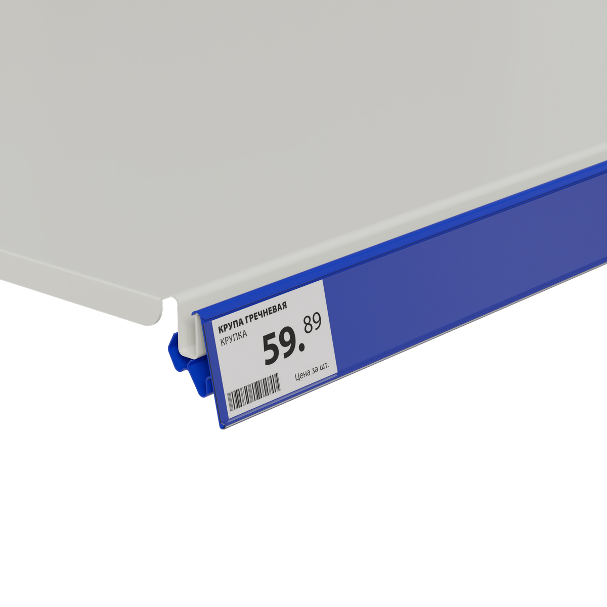 Фиксируется на стеллажах TEGOMETALL, MAGO, РУСЬ и подобных. Возможна установка двух положений наклона ценника к торцу полки. Высота - 39, 60 мм