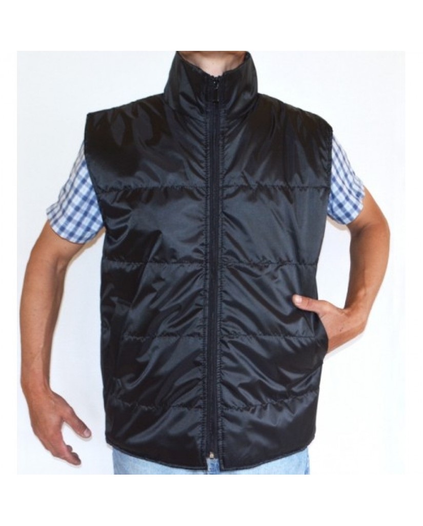 Жилет выполнен из безопасного и легкого материала, утеплен, прост в уходе. Оснащен молнией. Силуэт - прямой, цвет - черный.
