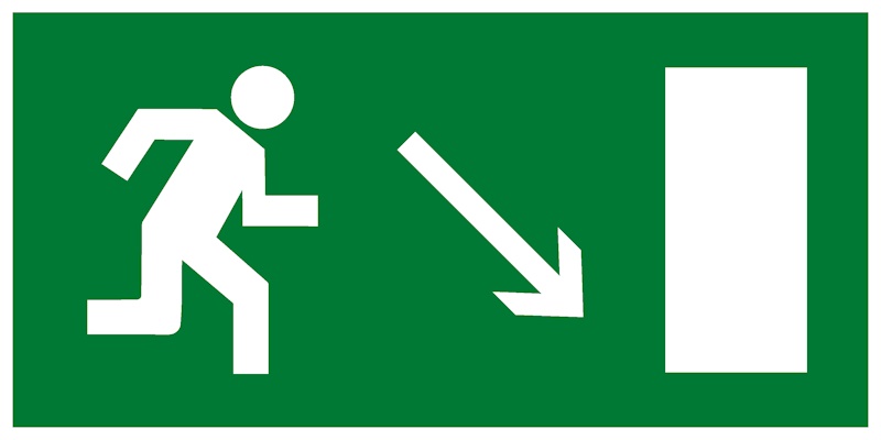 Эвакуационный знак Е07 используется для указания направления движения к эвакуационному выходу по наклонной плоскости – направо вниз. Устанавливается на путях эвакуации. Изготавливается на белой самоклеящейся пленке.
