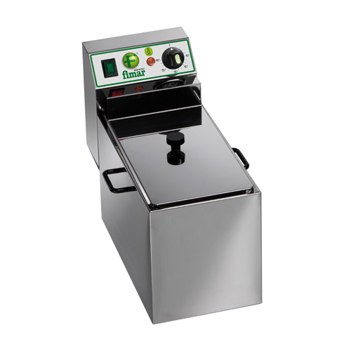 Фритюрница FT4, емкость ванны 4 литра, почасовое производство 4,5 кг, время обжаривания около 6 минут. Фритюрница электрическая настольная предназначена для приготовления продуктов в большом количестве жира. Корпус, ванна и крышка из нержавеющей стали, выдвижные корзины из хромированной проволоки, ручки корзин и крышек из термоизолирующего пластика, ТЭНы из нержавеющей стали, термостат 50:180 ° C, предохранительный термостат с кнопкой возврата в исходное состояние, в исполнении с двумя ваннами с двойным термостатом для независимого использования, съемные верхний блок и ТЭНы.