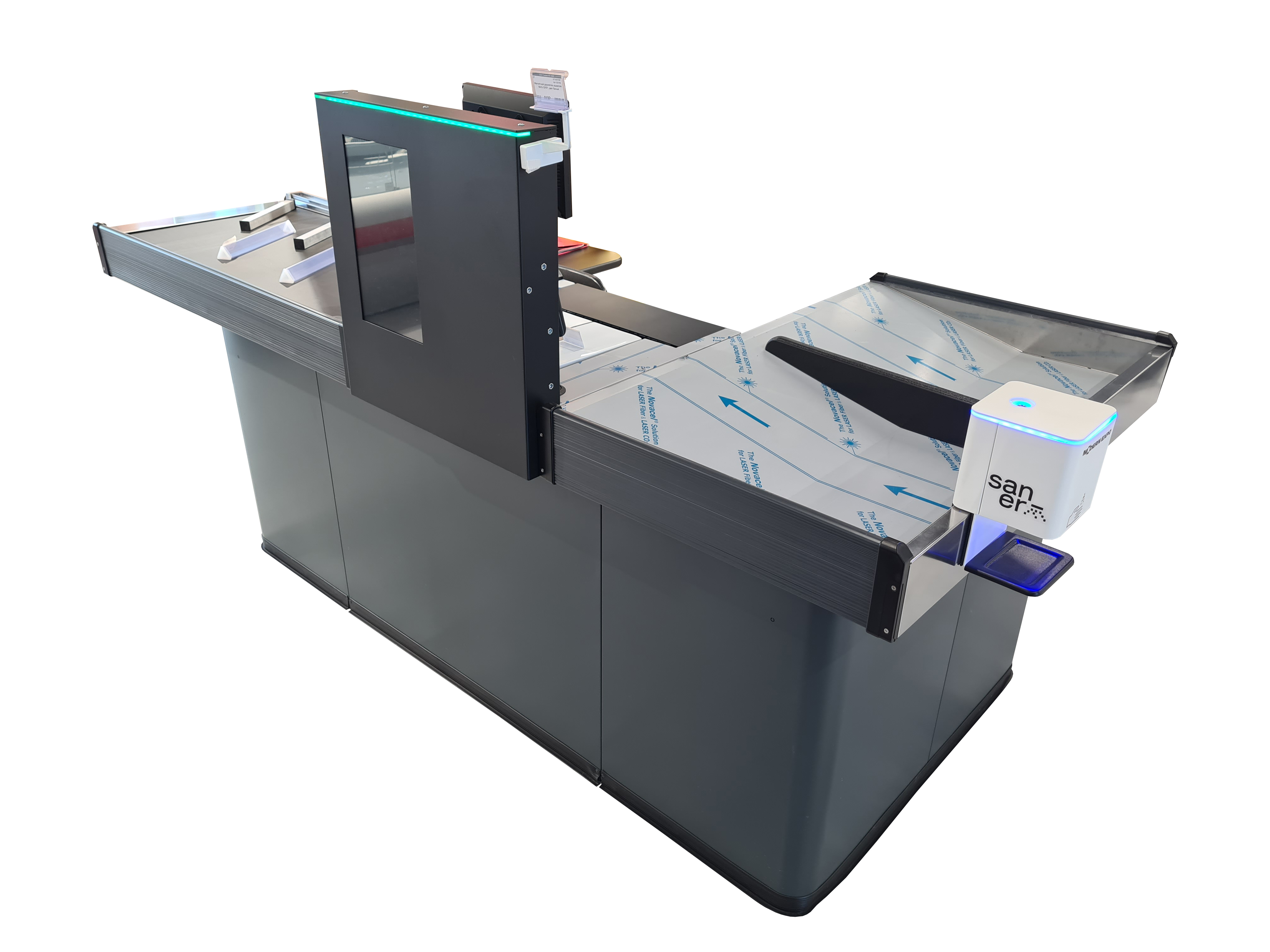 Цветной светодиодный индикатор информирует о рабочем состоянии кассового аппарата и помогает посетителям ориентироваться в торговом пространстве. Современный и уникальный дизайн, отвечающий строгим требованиям эргономики. LED-подсветка встоена в модуль транспортера, защиту сканера и в плафон мачты. Предлагаемые размеры и аксессуары позволяют удовлетворить потребности всех торговых площадей, от магазинов до гипермаркетов. Длина кассового бокса 2500мм. Длина транспортера 1050мм. Ширина накопителя 1150мм. Длина накопителя 900мм.