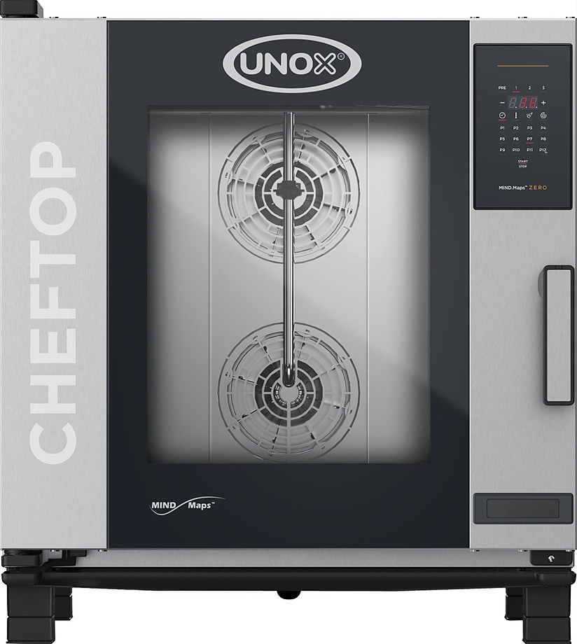 Пароконвектомат UNOX XEVC-0711-EZRM серии CHEFTOP MIND.Maps™ ZERO предназначен для приготовления различных блюд, выпечки хлебобулочных и кондитерских изделий на предприятиях общественного питания и торговли, в пекарнях и кондитерских. Модель оснащена встроенной в дверь светодиодной LED-подсветкой и C-образными с зубчатыми нишами направляющими. Внутреннее открывающееся стекло облегчает чистку и обеспечивает максимальную гигиену. Камера с закругленными углами выполнена из нержавеющей стали AISI 304, направляющие - из профилированной стали, дверной замок - из высокопрочного самосмазывающегося технополимера, внутренний штифт дверной ручки - из углеродного волокна.