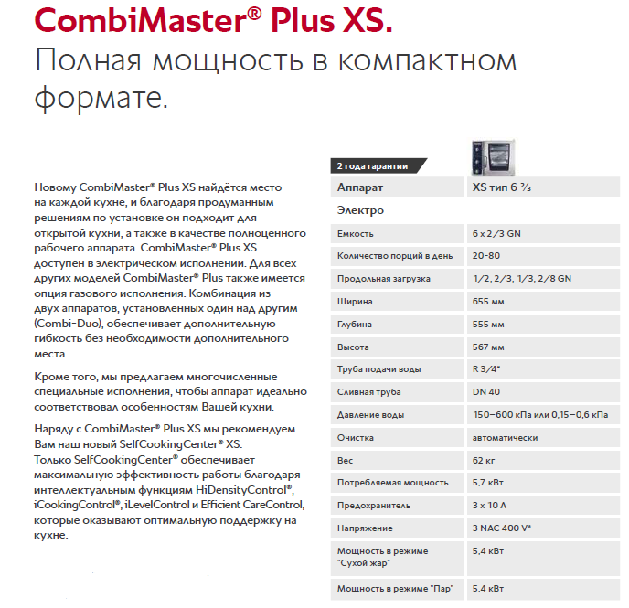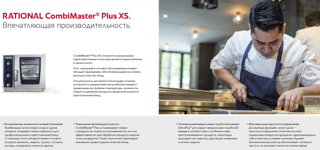 Помимо компактных размеров (глубина всего 55,5 см., ширина 65,5 см. и высота 56,7 см.) CombiMaster Plus XS отличается продуманными технологиями, современным дизайном и эргономичностью. Компания RATIONAL расширяет серию CombiMaster Plus, дополняя ее линейкой 6 x 2/3 и не отказавшись при этом от производительности и интеллектуальных функций. Большой дверной проём оснащен энергоэффективным тройным остеклением, стекла которого открываются для простой и эффективной очистки каждого из стекол. Идеальный обзор рабочей камеры обеспечивается светодиодными полосами на двери. Разумеется, этот «малыш» также оснащен функцией автоматической мойки. «Таким образом, этот аппарат, как и SelfCookingCenter XS, идеально подходит для открытых кухонь, а также в качестве полноценного рабочего аппарата в ресторане», — подчеркивает Антон Винарский, корпоративный шеф-повар RATIONAL в России.