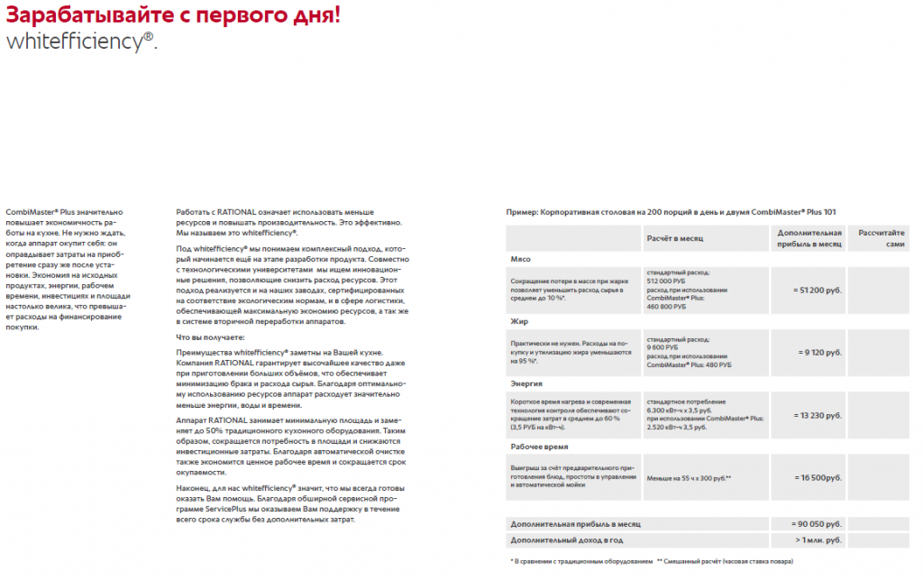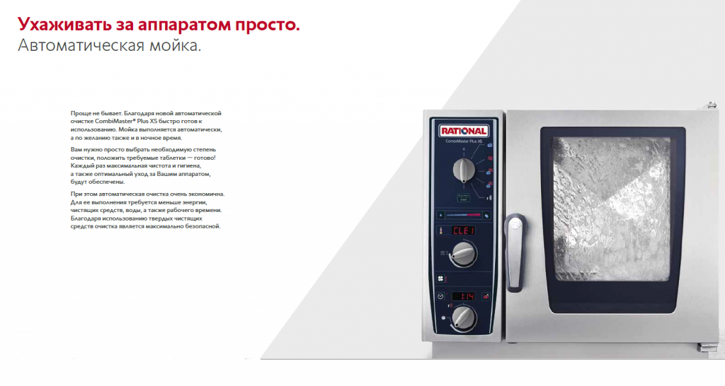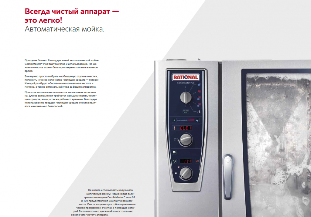 При этом автоматическая очистка также очень экономична. Для ее выполнения требуется меньше энергии, чистящих средств, воды, а также рабочего времени. Благодаря использованию твердых чистящих средств очистка является максимально безопасной. «Как в новых моделях CombiMaster Plus, так и в SelfCookingCenter мы всегда учитываем особые потребности наших клиентов», — объясняет принцип технологических разработок компании Пётр Афанасьев, Генеральный директор ООО «РАЦИОНАЛЬ РУС».