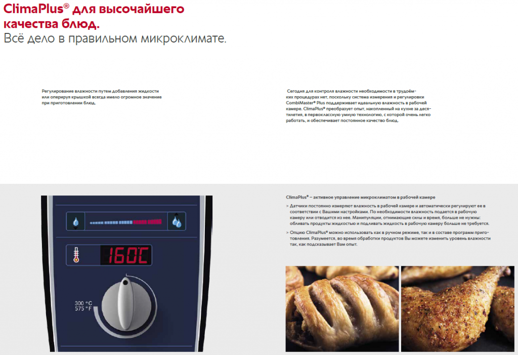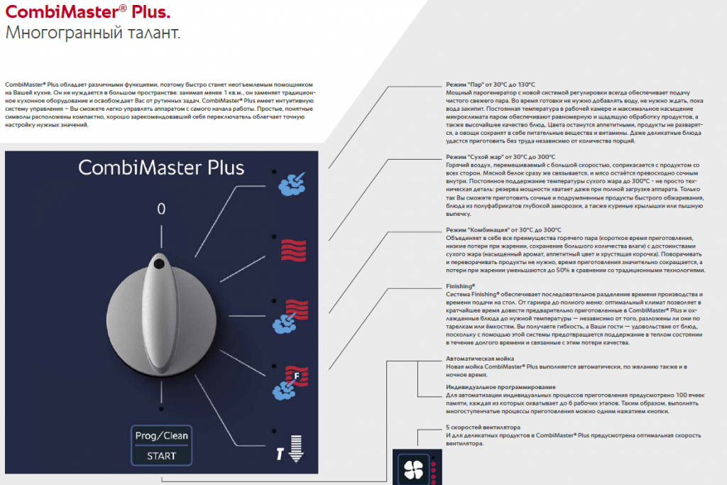 Аппараты CombiMaster Plus обладают функциями, которые просты в использовании и обеспечивают высочайшее качество блюд. Например, запатентованная система распределения воздушных потоков оптимально распределяет тепло в рабочей камере и гарантирует идеальные результаты приготовления. Её тандем с оптимизированной геометрией рабочей камеры позволяет быстро готовить вкусные блюда, гарантируя поджаристую корочку, хрустящую панировку и сочное жаркое. Новая автоматическая мойка CombiMaster® Plus обеспечит максимальную чистоту и гигиену, а также оптимальный уход за Вашим аппаратом. Вам нужно просто выбрать необходимую ступень очистки, положить нужное количество чистящих средств — готово!