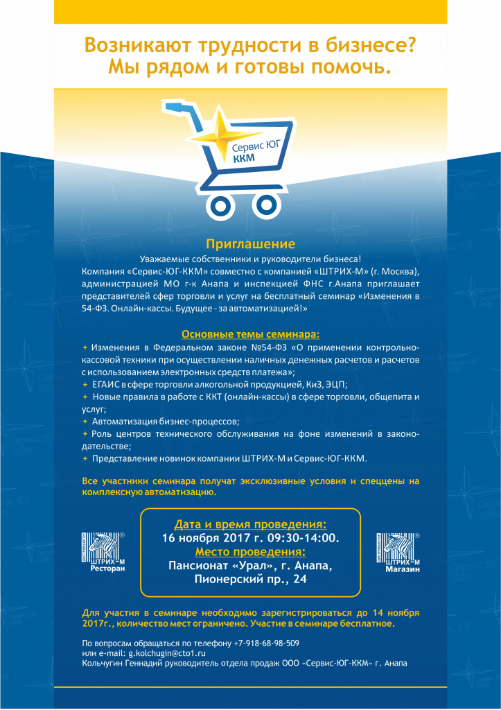 Компания «Сервис-ЮГ-ККМ» совместно с компанией «ШТРИХ-М» (г.Москва), администрацией МО г-к Анапа и инспекцией ФНС г.Анапа приглашает представителей сфер торговли и услуг на бесплатный семинар «Изменения в 54-ФЗ. Онлайн-кассы. Будущее - за автоматизацией!»